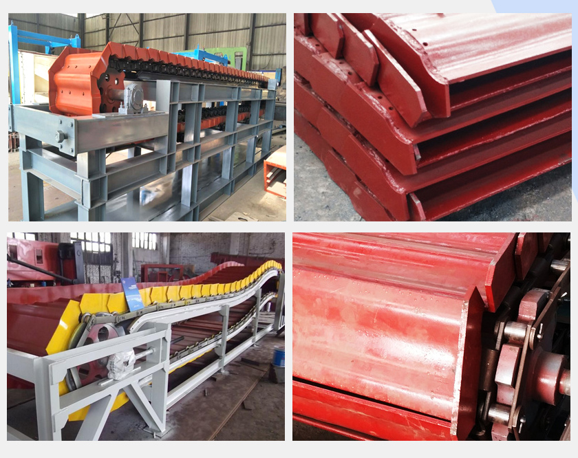 鱗板輸送機主要由頭輪裝置、鏈板組合裝置、尾輪組合裝置、尾輪張緊裝置、機架、驅動裝置組成。
